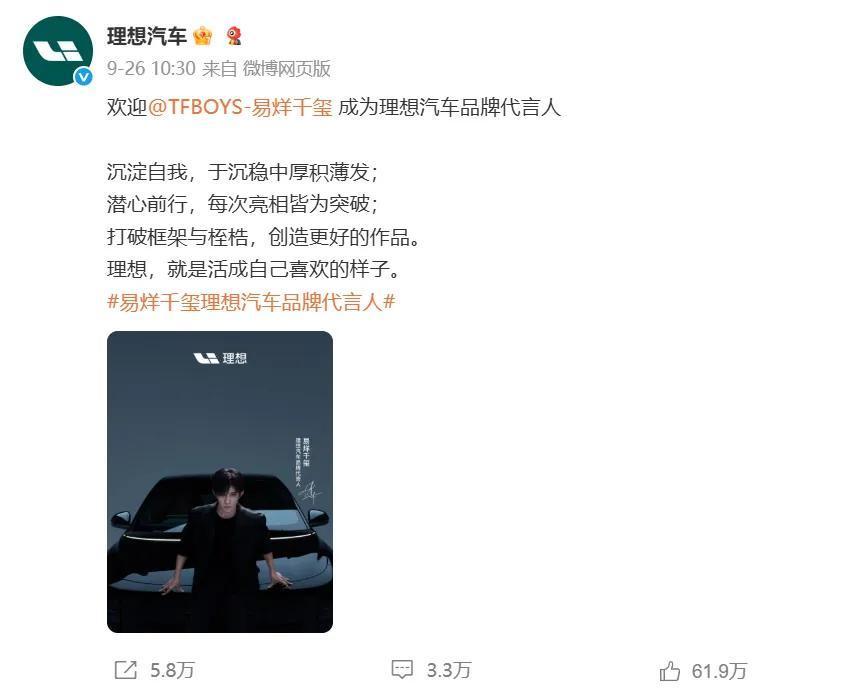 2025年9月26日,理想汽车宣布易烊千玺成为理想汽车第一位品牌代言人,这与李想过去的说法有所出入。