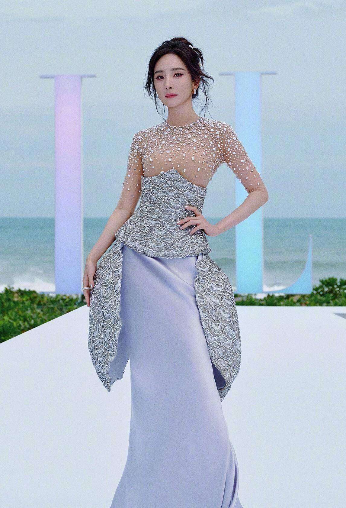 这套礼服原本设计大胆,上半身薄纱透视拼接珍珠,模特原版能隐约看到肩颈线条。但杨幂团队显然做了“本土化改造”:内衬加了肉色打底,珍珠密度也比原版增加近30%。有时尚博主对比发现,修改后的礼服失去了层次感,密集的珍珠让上半身显得臃肿,尤其在三亚强光下,确实有几分零食“雪米饼”的既视感。不过也有粉丝力挺:“总比原版走光强,40岁女星注重得体没错。”其实这不是杨幂第一次“魔改”高定。2023年Met Gala她穿的Valentino礼服就被扒出修改了领口高度,去年金鸡奖的Armani长裙也悄悄加长了裙摆。时尚评论人李女士分析:“国内明星面对红毯往往陷入两难——既要保持话题度,又怕过于前卫引发争议。杨幂这次选择保守修改,本质是流量时代的安全牌。”