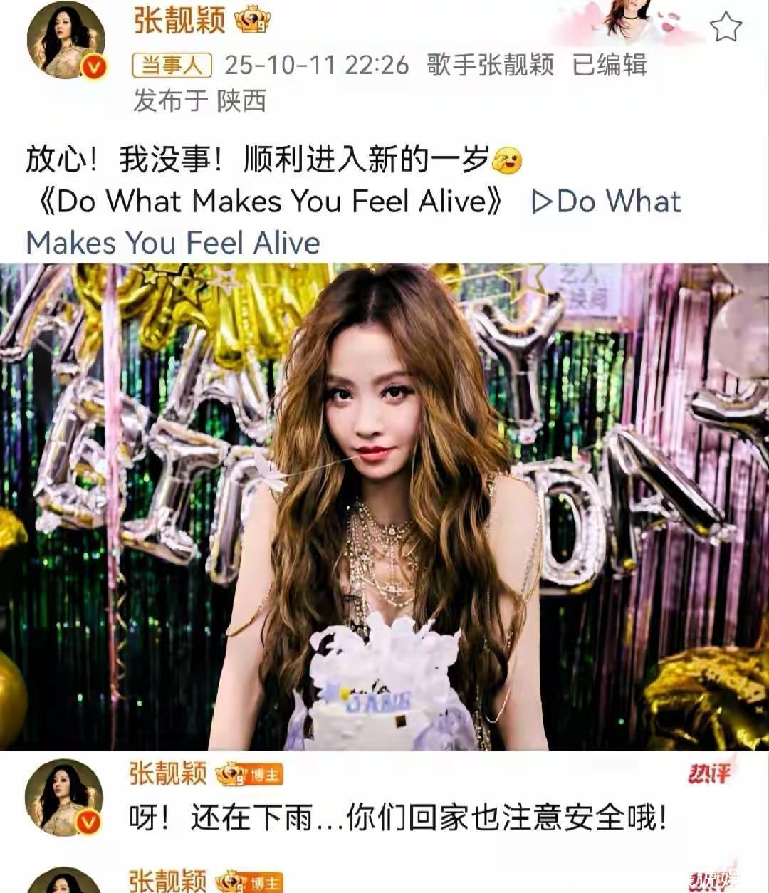 演唱会结束后,张靓颖迅速在微博报平安,称“放心!我没事!顺利进入新的一岁”。两米高台怎么可能没事,她这样说也只是不想让粉丝们担心而已。